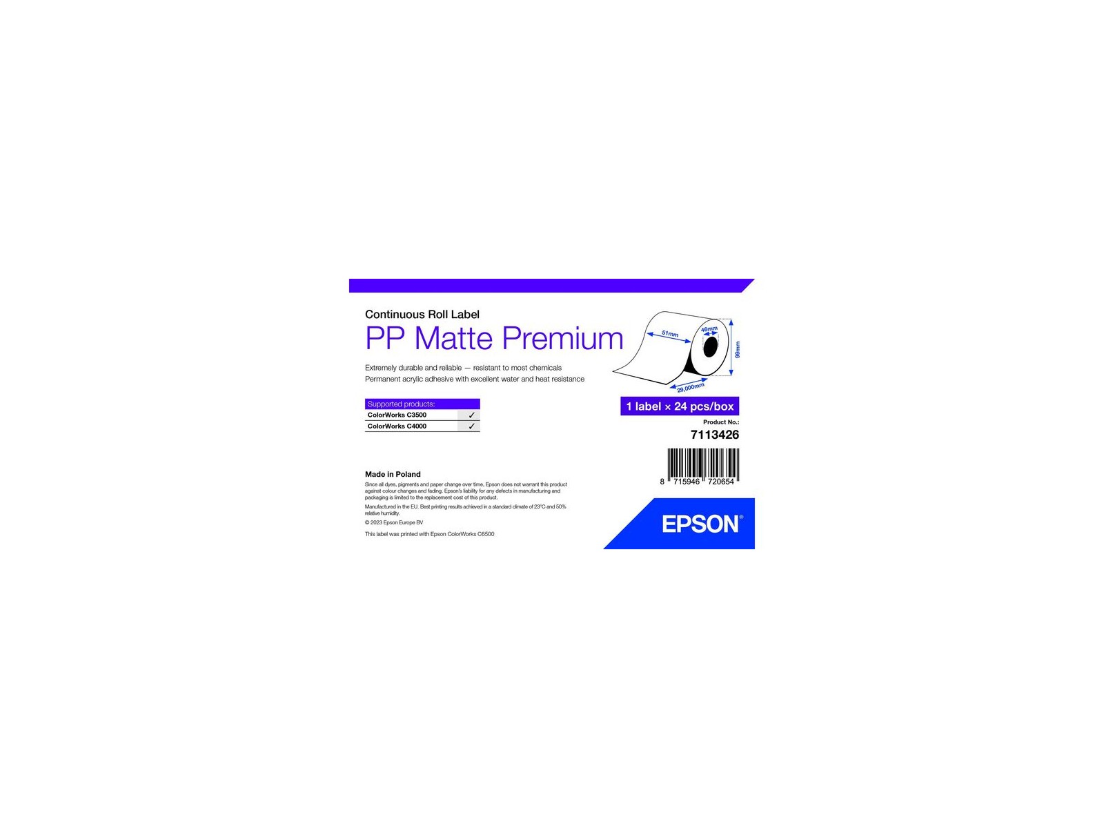 7113426 7113426 Epson PP Matte Label Premium, Continuous Roll, 51mm x 29m Acrylic Features DSE