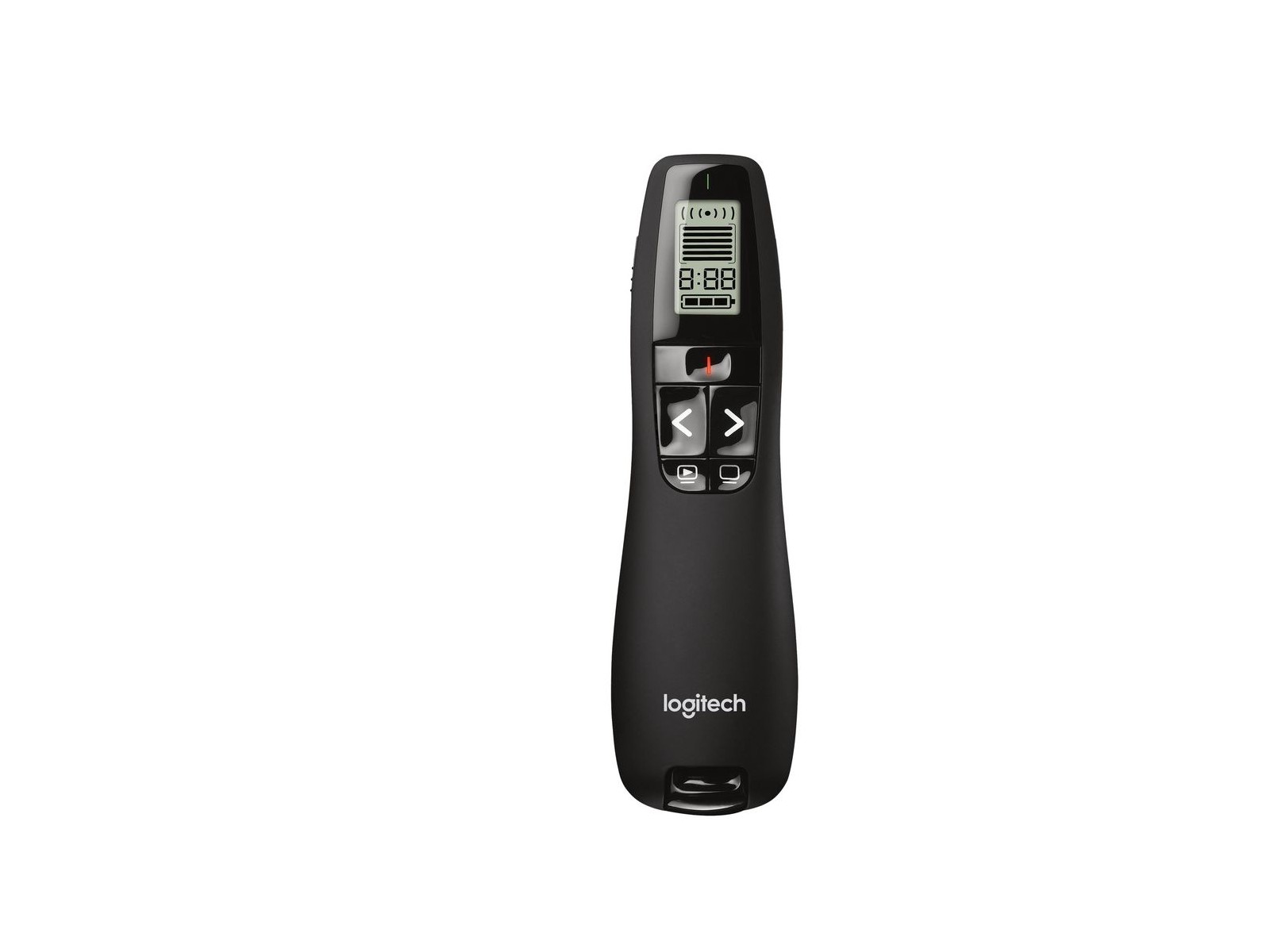 910-003506 Logitech R700, 2.4GHz, 30m max, LCD, 2x AAA 788675 LCD R700, 2.4GHz, 30m max, LCD, 2x AAA Make your point Brilliant red laser pointer helps you get their attention—and keep it. You’re in control Navigate through your presentation with confidence with the intuitive slideshow controls. Work the crowd The 100-foot (30-meter) range helps you make ordinary presentations extraordinary. Brilliant red laser pointer Your audience will see exactly where you point. LCD display Keep track of time, battery, and wireless reception with a glance or with silent, vibrating alerts. You remain focused on your presentation, not the clock. Up to 100-foot (30-meter) range You’ll enjoy the freedom to move around the room and mingle with your audience for greater impact. A reception-level indicator ensures you don’t wander too far. Intuitive slideshow controls Buttons are easy to find by touch. And the smooth contours feel great in your hand. You’ll be in control from the first slide to the last. Plug-and-play wireless receiver There’s no software to install. Just plug the receiver into a USB port to begin. And when the show is over, you can store the receiver in the presenter.