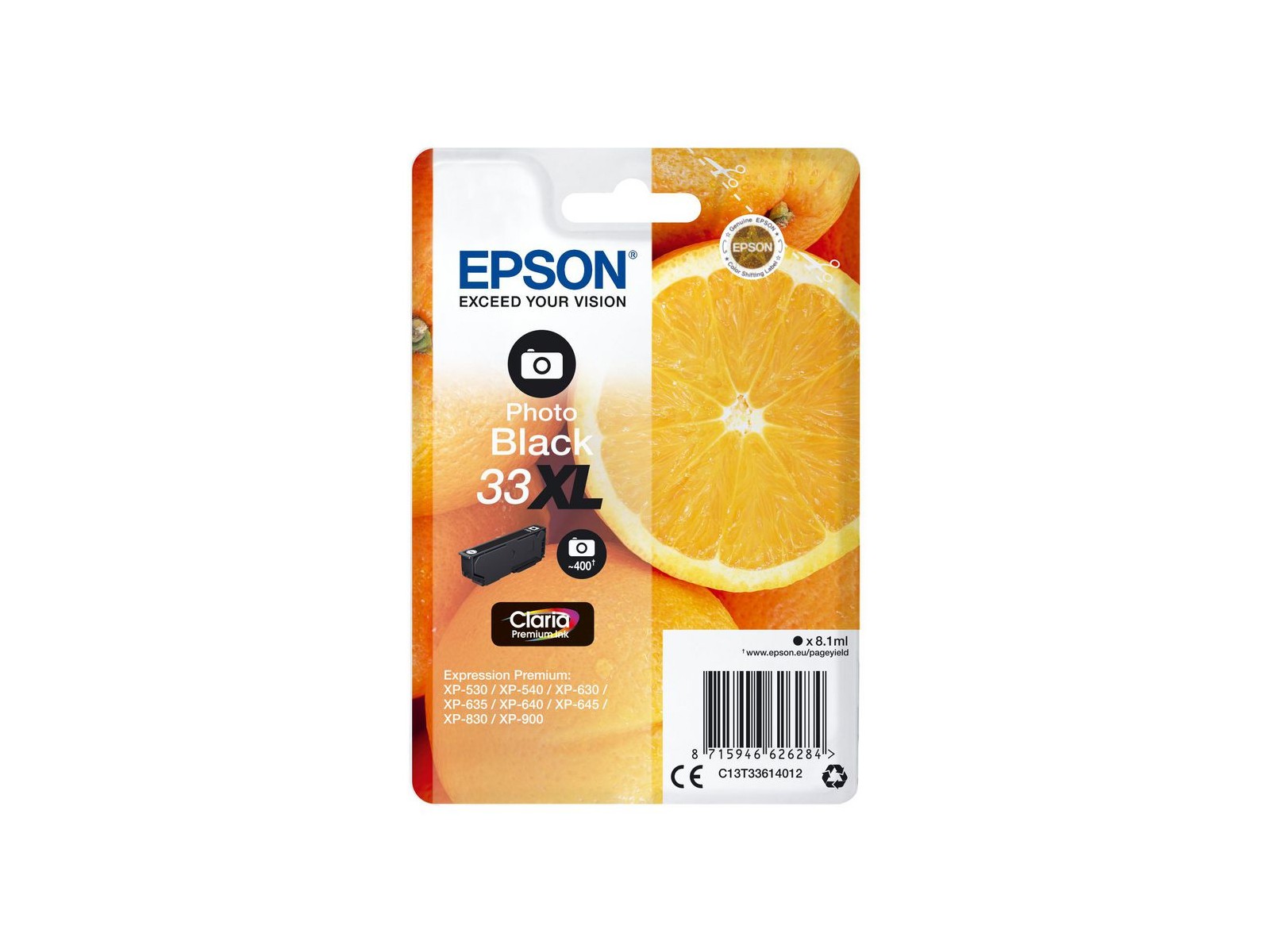 C13T33614022 Epson Singlepack Photo Black 33XL Claria Premium Ink 1 Singlepack Photo Black 33XL Claria Premium Ink Save up to 30% ink2 with Epson’s individual ink cartridges With Epson’s individual inks, you only replace the colour used, saving you up to 30% ink2 compared to competitors’ tri-colour cartridges. Reduce your printing costs with XL inks Epson offers a choice of standard or extra large (XL) ink cartridges across its latest ink ranges. XL inks are ideal if you print high volumes and can reduce your printing costs by up to 25%3. Epson inks are optimised for Epson printers Epson inks and papers have been developed to work hand-in-hand with Epson printers to produce the best results time and time again.