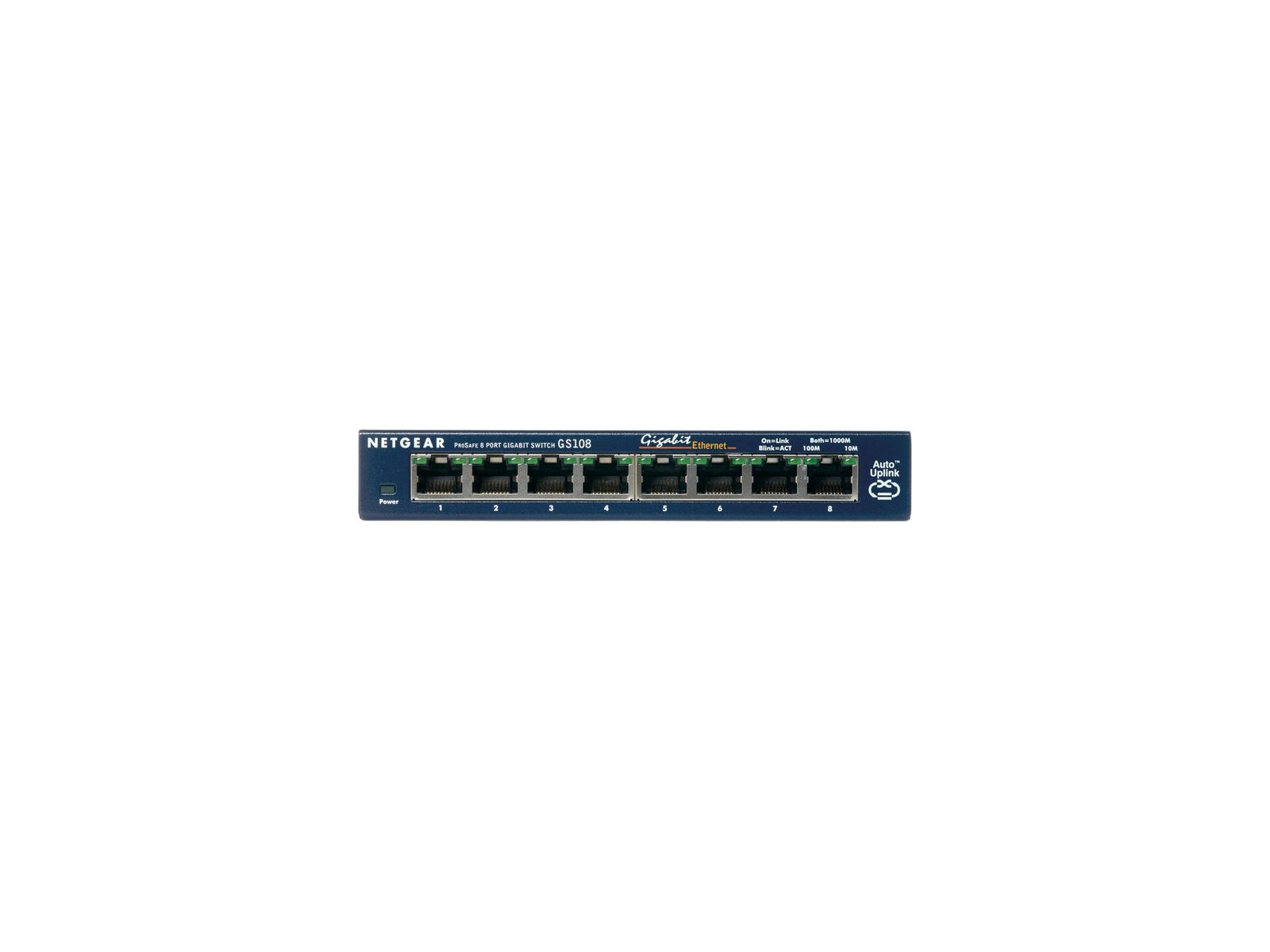 GS108GE Netgear GS108 - 8 Port Gigabit Ethernet (10/100/1000) Network Switch GS108GE 8000 voci GS108 - 8 Port Gigabit Ethernet (10/100/1000) Network Switch Now you can have a powerful, high-speed network on a small scale. NETGEAR's GS108 Gigabit Ethernet Switch lets you build a system that provides a full, dedicated 1000, 100, or 10 Mbps connection so you can move very large files across your network instantly. The GS108 also lets you painlessly integrate 10, 100, and 1000 Mbps devices. This potent switch is packed with ease-of-use features to simplify your workday experience. It's compact design fits neatly into small work spaces and, since it's self-cooling without a fan, it runs silently and unobtrusively.