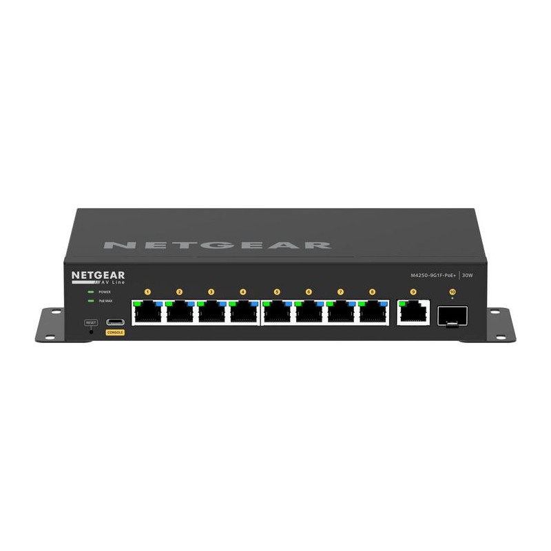 GSM4210PD Netgear Switch GSM4210PD 10PT M4250-9G1F-POE+ MANA Switching engineered for 1G AV over IP with versatile mounting options for under a table or behind a display. Pre-configured for out of the box functionality! POWERFUL AV SWITCHES MADE SIMPLE Pre-configured to get you up and running faster FAST, EASY CONFIGURATION FOR AV PROS A streamlined interface enables factory default AV settings or user-specified AV profiles to be assigned to individual ports with just a few clicks. FOCUS ON THE EVENT NOT FAN NOISE Most models have quiet mode which greatly reduces fan noise, and some models are even fanless. DESIGNED FOR AV OVER IP RIGHT OUT OF THE BOX With built-in NETGEAR IGMP Plus™, there's little-to-no setup required for flawless Video over IP delivery. Enable multicasting right out of the box.