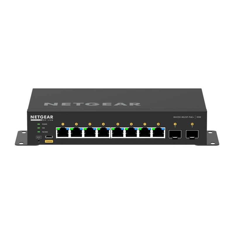 GSM4210PX Netgear Switch GSM4210PX 10PT M4250-8G2XF-POE+ MAN Switching engineered for 1G AV over IP with versatile mounting options for under a table or behind a display. Pre-configured for out of the box functionality! POWERFUL AV SWITCHES MADE SIMPLE Pre-configured to get you up and running faster FAST, EASY CONFIGURATION FOR AV PROS A streamlined interface enables factory default AV settings or user-specified AV profiles to be assigned to individual ports with just a few clicks. FOCUS ON THE EVENT NOT FAN NOISE Most models have quiet mode which greatly reduces fan noise, and some models are even fanless. DESIGNED FOR AV OVER IP RIGHT OUT OF THE BOX With built-in NETGEAR IGMP Plus™, there's little-to-no setup required for flawless Video over IP delivery. Enable multicasting right out of the box.