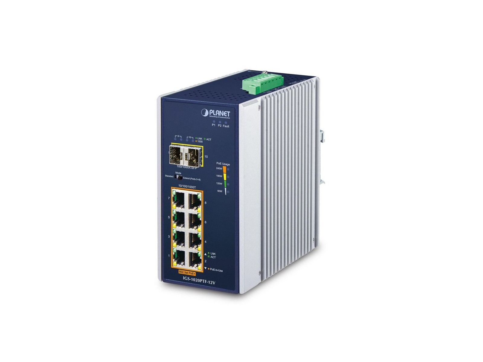 IGS-1020PTF-12V Planet Industrial 8-Port 10/100/1000T 802.3at PoE + 2-Port 100/1000X SFP Ethernet Switch w/ 12V Booster FCC Part 15 Class A, CE/IEC 60068-2-27 (shock)/IEC 60068-2-32 (free fall)/IEC 60068-2-6 (vibration) Industrial 8-Port 10/100/1000T 802.3at PoE + 2-Port 100/1000X SFP Ethernet Switch w/ 12V Booster Cost-effective Full PoE+ Power and Gigabit Extension Solution Ideal for Hardened Environment Featuring Plug and Play designed to be installed in heavy industrial demanding environments, PLANET IGS-1020PTF-12V is an Industrial-grade, DIN-rail type Unmanaged Gigabit Ethernet PoE+ Switch with eight 10/100/1000BASE-T ports featuring IEEE 802.3at PoE+ and two 100/1000BASE-X fiber optic interfaces for uplink connection. The IGS-1020PTF-12V is designed with redundant power system and is able to operate reliably, stably and quietly in any hardened environment without affecting its performance. It comes with a total power budget of up to 240 watts for different kinds of PoE applications and operating temperature ranging from -40 to 75 degrees C in a rugged IP30 aluminum housing. Convenient and Reliable Power System To facilitate the 802.3at PoE+ usage with the commonly-used 12~48V DC power input for transportation and industrial-level applications, the IGS-1020PTF-12V adopts 12~56V DC to 54~56V DC power boost technology to solve power source issue but does not require special power supplies. Its wide-ranging voltages design is suitable for worldwide operability with high availability applications requiring dual or backup power inputs. 802.3at PoE+ Power and Ethernet Data Transmission Extension The IGS-1020PTF-12V has a built-in solid DIP switch providing “Standard” and “Extend” operation modes. The IGS-1020PTF-12V operates as a normal IEEE 802.3at PoE+ Switch in the “Standard” operation mode. In the “Extend” operation mode, the IGS-1020PTF-12V operates on a per-port basis at 10Mbps full duplex operation and can support 20~25-watt PoE power output over a distance of up to 250 meters, overcoming the 100-meter limit on Ethernet UTP cable. Fiber Optic Link Capability for Flexible Distance Extension The additional two mini-GBIC slots built in the IGS-1020PTF-12V supports SFP auto-detection and dual speed as it features 100BASE-FX and 1000BASE-SX/LX SFP (small form-factor pluggable) fiber-optic modules, meaning the administrator now can flexibly choose the suitable SFP transceiver according to the transmission distance or the transmission speed required to extend the network efficiently. The distance can be extended from 550 meters to 2 kilometers (multi-mode fiber) and 10/20/30/40/50/60/70/120 kilometers (single-mode fiber or WDM fiber). They are well suited for applications to uplink to backbone switch and monitoring center in long distance. Environmentally-hardened Design With the IP30 aluminum industrial case, the IGS-1020PTF-12V provides a high level of immunity against electromagnetic interference and heavy electrical surges which are usually found on plant floors or in curb-side traffic control cabinets without air conditioning. It features a ventilated construction in which a cooling fan is not necessary, thereby making its operation noiseless. Being able to operate under the temperature range from -40 to 75 degrees C, the IGS-1020PTF-12V can be placed in almost any difficult environment. Robust Protection The IGS-1020PTF-12V provides contact discharge of ±6KV DC and air discharge of ±6KV DC for Ethernet ESD protection. It also supports ±6KV surge immunity to improve product stability and protects users’ networks from devastating ESD attacks, making sure the flow of operation does not fluctuate. Intelligent LED Indicator for Real-time PoE Usage The IGS-1020PTF-12V helps users to monitor the current status of PoE power usage easily and efficiently by its advanced LED indication. Called “PoE Power Usage”, the front panel of the Industrial Gigabit PoE+ Switch has four orange LEDs indicating 60W, 120W, 180W and 240W of PoE power usage. Flexible and Easy Installation with Limited Space The IGS-1020PTF-12V is designed to be installed in different environments, such as wall enclosure. It can be installed by fixed wall mounting or DIN rail mounting, thereby making its usability more flexible and easier in any space-limited location.