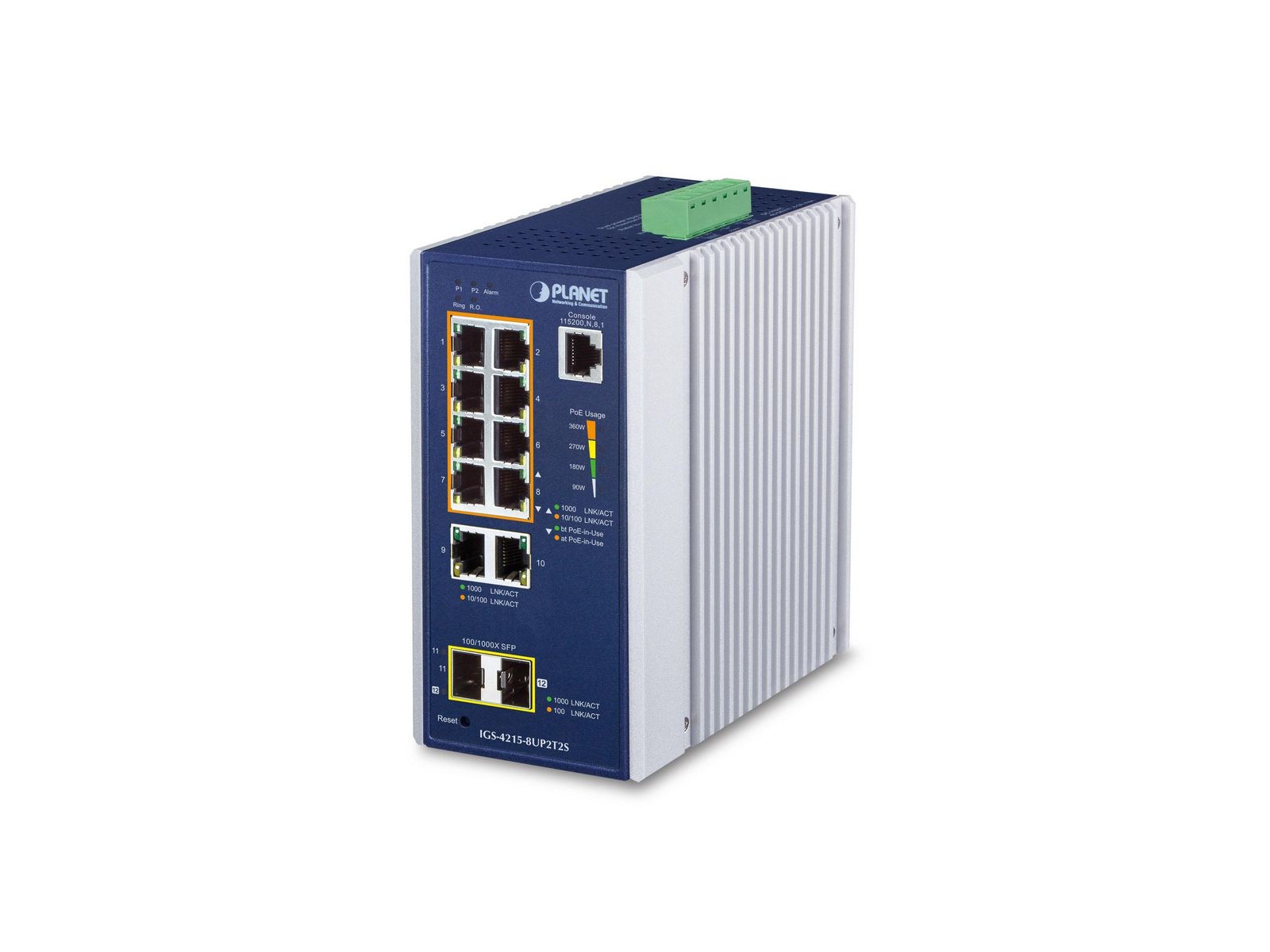 IGS-4215-8UP2T2S Planet IGS-4215-8UP2T2S EN 55032/EN 55035/FCC Part 15 Class A/ICES-003 issue 7/IEC 60068-2-27 (shock)/IEC 60068-2-32 (free fall)/IEC 60068-2-6 (vibration) IGS-4215-8UP2T2S IP30 Industrial L2/L4 8-Port 10/100/1000T 802.3bt PoE + 2-Port 10/100/1000T + 2-Port 100/1000X SFP Managed Switch (-40~75 degrees C, 8-port 95W PoE++, 802.3bt/Legacy/Force modes, dual redundant power input on 48~54VDC terminal block, SNMPv3, 802.1Q VLAN, IGMP Snooping, TLS, SSH, ACL, 250m Extend mode, supports ERPS Ring, CloudViewer app, MQTT and Cybersecurity feature)