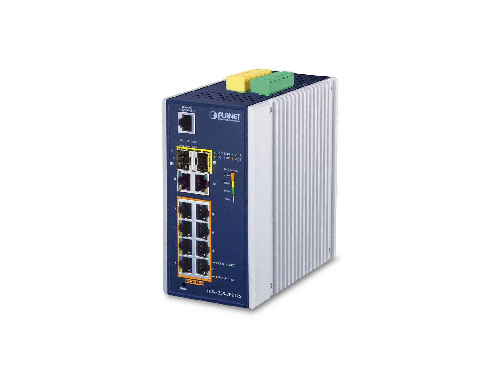 PLANET Industrial 8-port Gigabit 802.3at PoE+ Switch, IGS-5225-8P2T2S, is equipped with a rugged IP30 metal case for stable operation in heavy industrial demanding environments. Thus, the IGS-5225-8P2T2S provides a high level of immunity against electromagnetic interference and heavy electrical surges which are usually found on plant floors or in curbside traffic control cabinets.