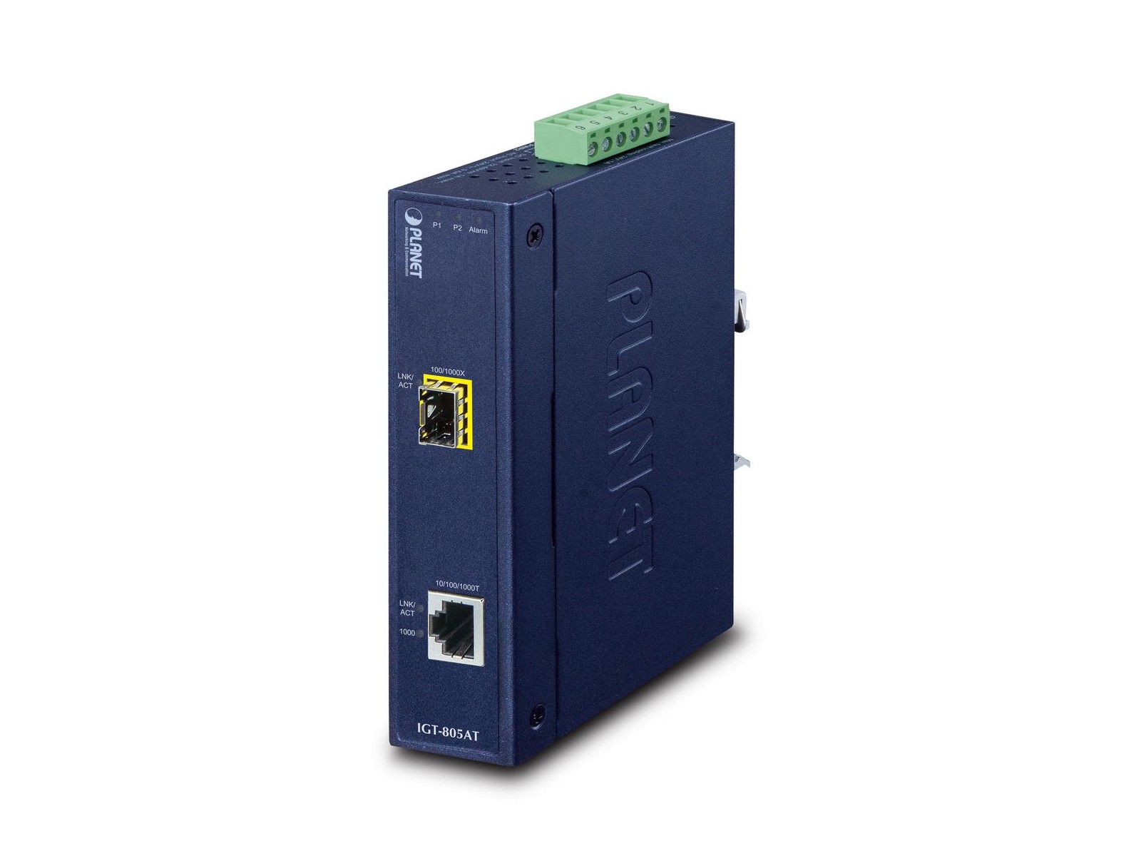 IGT-805AT Planet Industrial 10/100/1000BASE-T to 100/1000BASE-X SFP Media Converter FCC Part 15 Class A, CE Industrial 10/100/1000BASE-T to 100/1000BASE-X SFP Media Converter Flexible, Reliable and Industrial-grade Network Distance Extension Solution PLANET IGT-805AT is an Industrial Gigabit Media Converter providing non-blocking wire-speed performance and great flexibility for Gigabit Ethernet extension in harsh industrial environment. It is equipped with one 10/100/1000BASE-T RJ45 copper and one 100/1000BASE-X SFP fiber optic interface delivered in an IP30 rugged strong case with redundant power system. The IGT-805AT is well suited for applications in deploying surveillance system, and securing control and wireless service in climatically demanding environments with wide temperature range from -40 to 75 degrees C. With 9K jumbo frame feature support, the IGT-805AT can handle extremely large amounts of data transmission in a secure topology linking to a backbone or high-power servers. Fiber-Optic Link Capability Enables Extension of Network Deployment The mini-GBIC SFP slots built in the IGT-805AT support dual speed as it features 100BASE-FX and 1000BASE-SX/LX SFP (Small Form-factor Pluggable) fiber-optic modules. Now the administrator can flexibly choose the suitable SFP transceiver according to not only the transmission distance, but also the transmission speed required. The distance can be extended from 550 meters to 2km (multi-mode fiber) and up to 10/20/40/60/80/120 kilometers (single-mode fiber or WDM fiber). They are well suited for applications within the enterprise data centers and distributions. Enhanced Smart Management Features The IGT-805AT provides auto MDI/MDI-X on its TP port and built-in Link Fault Pass-through function (LFP). The LFP function includes Link Loss Carry Forward (LLCF) and Link Loss Return (LLR), both of which can immediately alarm administrators the problem of the link media and provide efficient solution to monitoring the net. - LLCF means when a device connected to the converter and the TP line loses the link, the converter’s fiber port will disconnect the link of transmission. - LLR means when a device connected to the converter and the fiber line loses the link, the converter’s fiber port will disconnect the link of transmission. Therefore, the IGT-805AT greatly supports the administrators to manage the network efficiently. Environmentally Hardened Design The IGT-805AT is equipped with the slim-type IP30 metal case for easy deployment in heavy Industrial demanding environments. With IP30 industrial case protection, the IGT-805AT provides a high level of immunity against electromagnetic interference and heavy electrical surges which are usually found on plant floors or in curbside traffic control cabinets. Being able to operate under the temperature range from -40 to 75 degrees C, the IGT-805AT can be placed in almost any difficult environment. The IGT-805AT also allows either DIN rail or wall mounting for efficient use of cabinet space. Convenient and Reliable Power System To enhance the operation reliability and flexibility, the IGT-805AT is equipped with two DC power input connectors for redundant power supply installation. It also possesses an integrated power supply source with wide-ranging voltages (12 to 48V DC or 24V AC) for worldwide high availability applications requiring dual or backup power inputs.