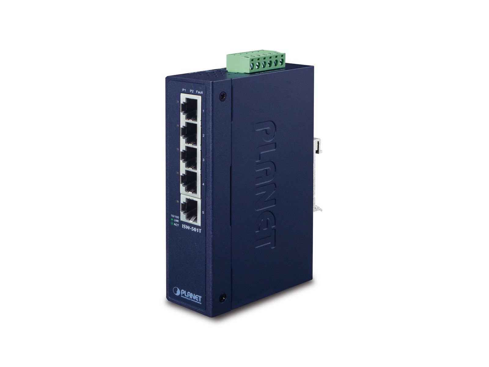 ISW-501T Planet 5-Port 10/100TX Industrial Fast Ethernet Switch FCC, CE, IEC 5-Port 10/100TX Industrial Fast Ethernet Switch Slim Type with more Practicability and Convenience PLANET ISW-501T, an Industrial 5-port Fast Ethernet Switch, provides non-blocking wire-speed performance in harsh industrial environment. It also provides 5-port 10/100BASE-TX RJ45 copper interfaces delivered in an IP30 rugged, strong case with redundant power system. Its slim case is suitable for such applications as surveillance system deployments, control management and wireless service in climatically demanding environments with wide temperature range from -40 to 75 degrees C. Energy Saving with Lower Power Consumption The ISW-501T, adopting the advanced green networking technology, provides the IEEE 802.3az protocol based power saving. This feature makes the ISW-501T consume very low power in full load operation mode, which helps conserve energy effectively but maintains high performance efficiently. Stable Performance under Difficult Environments The ISW-501T provides a high level of immunity against electromagnetic interference and heavy electrical surges which are usually found on plant floors or in curb-side traffic control cabinets. Being able to operate under the temperature range from -40 to 75 degrees C, the ISW-501T can be placed in almost any difficult environment. The ISW-501T also possesses an integrated power supply source with wide range of voltages (12 to 48V DC, 24V AC) for worldwide high availability applications requiring dual or backup power inputs. Robust Switch Performance Built in a high-performance switch architecture, the ISW-501T comes with five 10/100Mbps Fast Ethernet ports providing non-blocking switch fabric and wire-speed throughput as high as 1Gbps, and the 1K MAC address. Thus, the ISW-501T can transfer wire-speed packets without the risk of packet loss. The flow control function enables the ISW-501T to provide fast and reliable data transfer. All of the RJ45 copper interfaces in the ISW-501T support 10/100Mbps auto negotiation for optimal speed detection through RJ45 Category 5 or 5e cables. The standard auto-MDI/MDI-X support can detect the type of connection to any Ethernet device without requiring special straight-through or crossover cables.