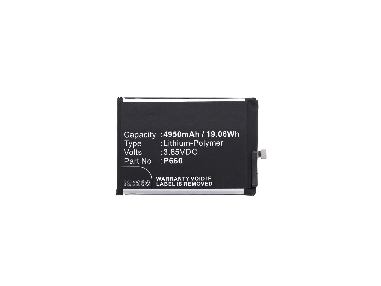 Battery for Nokia Mobile 19.06Wh 3.85V 4950mAh for G50,TA-1358,TA-1390,TA-1370,TA-1367,TA-13618 Discover the trusted quality of CoreParts with our Top Quality replacement Battery for Nokia Mobile 19.06Wh 3.85V 4950mAh for G50,TA-1358,TA-1390,TA-1370,TA-1367,TA-13618. Engineered to deliver unmatched performance, this 19.06 Wh battery ensures that your device remains powered and ready for all your demands. Produced in China with rigorous quality control, each component meets high standards for reliability and longevity. Backed by a 12 Month(s) warranty, CoreParts products offer you confidence in every use, knowing you're investing in sustainability and cost efficiency. Our easy-to-install parts help you avoid costly replacements, empowering you to extend the life of your devices, reduce e-waste, and support a greener future. Choose CoreParts for high-quality, value-driven solutions that stand up to daily use and deliver ongoing reliability. P660