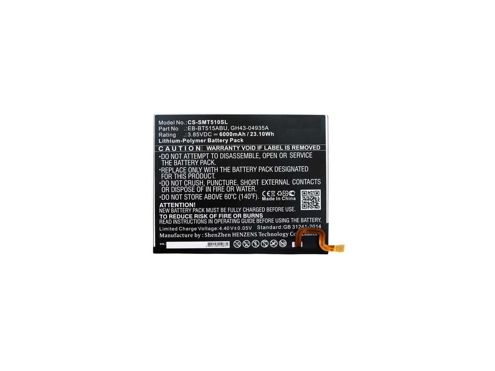 Battery for Samsung Tablet 23.10Wh Li-Pol 3.85V 6000mAh Black for Samsung Tablet Galaxy Tab A 10.1 2019, Galaxy Tab A 2019, SM-T510, SM-T515 Discover the trusted quality of CoreParts with our Top Quality replacement Battery for Samsung Tablet 23.10Wh Li-Pol 3.85V 6000mAh Black for Samsung Tablet Galaxy Tab A 10.1 2019, Galaxy Tab A 2019, SM-T510, SM-T515. Engineered to deliver unmatched performance, this 23.1 Wh battery ensures that your device remains powered and ready for all your demands. Produced in China with rigorous quality control, each component meets high standards for reliability and longevity. Backed by a 12 Month(s) warranty, CoreParts products offer you confidence in every use, knowing you're investing in sustainability and cost efficiency. Our easy-to-install parts help you avoid costly replacements, empowering you to extend the life of your devices, reduce e-waste, and support a greener future. Choose CoreParts for high-quality, value-driven solutions that stand up to daily use and deliver ongoing reliability. EB-BT515ABU, GH43-04935A, GH43-04936A