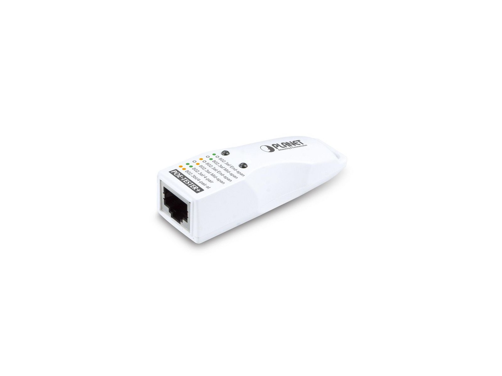 POE-TESTER+ Planet IEEE 802.3af/at/bt Power over Ethernet Tester POETESTERP NONE - Only use for non-battery items IEEE 802.3af/at/bt Power over Ethernet Tester Quick and easy test on RJ45 outlet for Power over Ethernet existence in a second PLANET POE-TESTER+ is a new generation easy-to-use PoE diagnostic adapter for network installers, system integrator, company MIS and even home users to quickly identify the existence of Power over Ethernet on applications network. It is designed to detect if the IEEE 802.3af/at/bt PoE voltage runs over the UTP cable and identify the type of PSE (Power Source Equipment) for troubleshooting. Plug and Show LED Indicators Simply connect the POE-TESTER+ to the PSE or the RJ45 outlet and the LED will light up when it detects the PoE voltage via the UTP cable and identifies the PSE to be mid-span, end-span, 802.3af PoE mode, 802.3at PoE+ mode or even the latest 4-pair 802.3bt PoE++ mode in a second. Identify PoE PSE Modes and Standards The POE-TESTER+ provides two bi-color LEDs for quick and easy PSE mode identification. A Power over Ethernet system comprises a PSE (Power Sourcing Equipment) and a PD (Powered Device). The PSE is a device that will provide power in a PoE setup. There are three types of PSE, Mode A, Mode B and 4-pair mode. The PSE may be a Mode A, end-span PoE switch or a Mode B, mid-span PoE injector or a 4-pair mode PSE that is end-span plus mid-span. The PD is a PoE-enabled terminal by PSE and thus consumes energy, such as IP network cameras, VoIP phones and wireless access points and more. PoE Installation Troubleshooting Although PDs that implement only Mode A with end-span or Mode B with mid-span are disallowed by the IEEE 802.3af/at standard, there are still some of the PDs that are designed to work with only one of the modes. Thus, it will cause the PoE PSE and PD not to be compatible with each other in the applications. For example, an end-span designed PoE switch cannot power on the remote mid-span only wireless access point. But most of the time, the installers would not exactly know what the remote PSE devices are. PLANET POE-TESTER+ checks your UTP cable for power and identifies its source, mid-span, end-span or mid-span + end-span. Make sure at the end of UTP cable there is existence of PoE, and then the next step is to check if the PD is compatible with the PSE, or it is a malfunctioned PD.