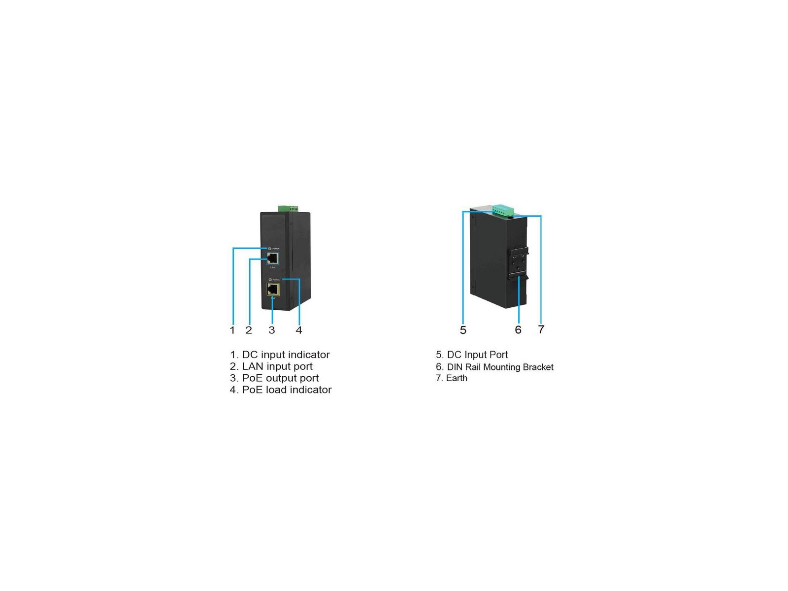 POEINJ-30W-IND MicroConnect Industrial DC Input Boost PoE Injector 30W TP-DCDC-1248GD-HP Industrial DC Input Boost PoE Injector 30W POEINJ-30W-IND is a single-port, industrial-scale, boost PoE injector. It provides 55Vdc, 0.55A power for remote PDs over 2 pairs output with 6KV (10/700us) surge protection. It supports 10/100/1000 of data speed. It works for 30W PoE PDs, such as wireless access points, network cameras, VoIP phones and other high power Ethernet terminals. Fully comply with IEEE802.3at and remains compatible with any IEEE802.3af compliant devices. POEINJ-30W-IND is designed for indoor use. It works with input voltage of 12-48Vdc and operates under -40℃to 65℃. It has detection chip inside, which will detect and classify PD before powering it. It will not apply power until a standardcompliant PD is detected. The effective distance is 100m over Cat5e/Cat6 cables. This model equipped standard DIN rail mounting bracket, which can easily jam into the guide rail