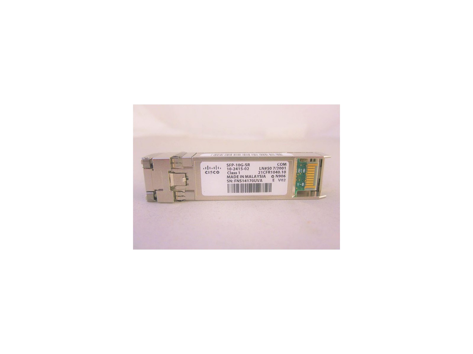 SFP-10G-SR= Cisco 10GBASE-SR SFP+ Module for MMF 10GBASE-SR SFP+ Module for MMF The Cisco® 10GBASE SFP+ modules offer customers a wide variety of 10 Gigabit Ethernet connectivity options for data center, enterprise wiring closet, and service provider transport applications. Main features of Cisco 10GBASE SFP+ modules include: -Smallest 10G form factor. -Supports 10GBASE Ethernet. -Hot-swappable input/output device that plugs into an Ethernet SFP+ port of a Cisco switch. -Provides flexibility of interface choice. -Supports "pay-as-you-populate" model. -Supports the Cisco quality identification (ID) feature that enables a Cisco switch to identify whether the module is certified and tested by Cisco. -Optical interoperability with 10GBASE XENPAK, 10GBASE X2, and 10GBASE XFP interfaces on the same link. The Cisco 10GBASE-SR Module supports a link length of 26m on standard Fiber Distributed Data Interface (FDDI)-grade multimode fiber (MMF). Using 2000 MHz*km MMF (OM3), up to 300m link lengths are possible.