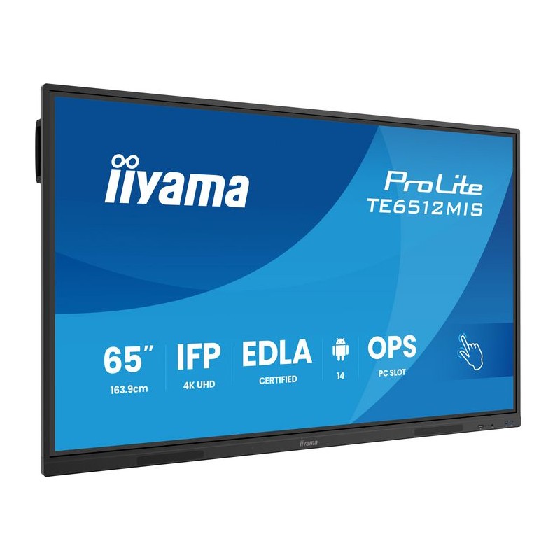 TE6512MIS-B4AG iiyama 65" iiWare13E , Android 14, 8/128GB, 40-Points PureTouch IR with Zero Gap - Air bonding, 3840x2160, UHD VA panel 65" iiWare13E , Android 14, 8/128GB, 40-Points PureTouch IR with Zero Gap - Air bonding, 3840x2160, UHD VA panel 65" iiWare13E , Android 14, 8/128GB, 40-Points PureTouch IR with Zero Gap - Air bonding, 3840x2160, UHD VA panel, Fan-less, Speakers 2x 20W front, VGA, HDMI 2x HDMI-out, 2x USB-C max 65W PD), Audio mini-jack and Optical Out (S/PDIF), USB Touch Interface, 400cd/m², Landscape mode, Media Play USB Ports, AntiGlare Glass, LAN, RS232C, Integrated iiWare (Note, ScreenSharePro, file- and web browser), Incl. WiFi/Bluetooth Module, VESA 600x400 (mount not included), Slot for optional PC (OPC)