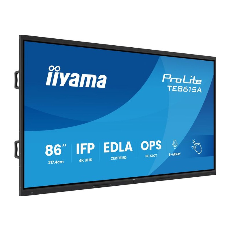 TE8615A-B1AG iiyama 86" Stylish IFP, iiWare21E (EDLA -Google-GMS-apps), Android 14 86" Stylish IFP, iiWare21E (EDLA -Google-GMS-apps), Android 14 86" Stylish IFP, iiWare21E (EDLA -Google-GMS-apps), Android 14, 16/128GB, 40-Points DeepContrast IR+ with Optical Bonding, 3840x2160, UHD IPS panel, Metal Housing, Fan-less, NFC, PIR (Motion sensor), Speakers 2x 20W front facing + 20W subwoofer, 8-Array Microphone, 2x HDMI, HDMI-out, DispayPort, 2x USB-C up to 100W PD, Audio out: mini-jack and Optical Out, 550cd/m², Landscape mode, Media Play USB Ports, AntiGlare Glass, LAN, WiFi6, BT5.0, RS232C, Integrated iiWare (WhiteBoard, iiShare (cast), browser, iiControl (DMS)), OPS PC Slot, VESA 800x600 (mount included)