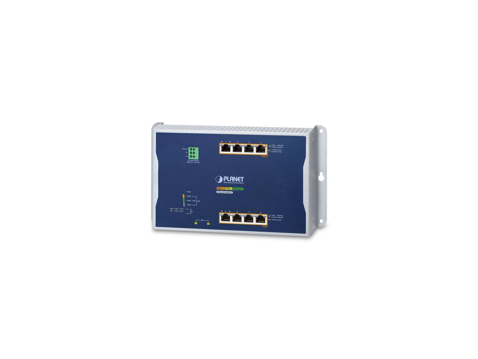 WGS-4215-8HP2S Planet Industrial 4-Port 10/100/1000T 802.3bt PoE + 4-Port 10/100/1000T 802.3at PoE + 2-Port 100/1000X SFP Wall-mount Managed Switch 40~75 degrees FCC Part 15 Class A, CE Industrial 4-Port 10/100/1000T 802.3bt PoE + 4-Port 10/100/1000T 802.3at PoE + 2-Port 100/1000X SFP Wall-mount Managed Switch 40~75 degrees