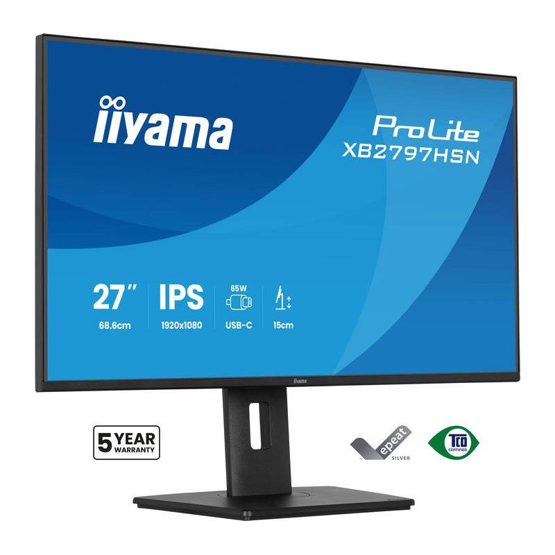 XB2797HSN-B1 iiyama "27" FHD Business IPS USB-C DOCK" "27" FHD Business IPS USB-C DOCK" 27" IPS-panel, 1920x1080, USB-C Dock (LAN/65W PD/DP-OUT), 15cm Height Adj. Stand, 1ms, 350cd/m², Speakers, HDMI, DisplayPort, USB HUB (2x3.2+2xC)